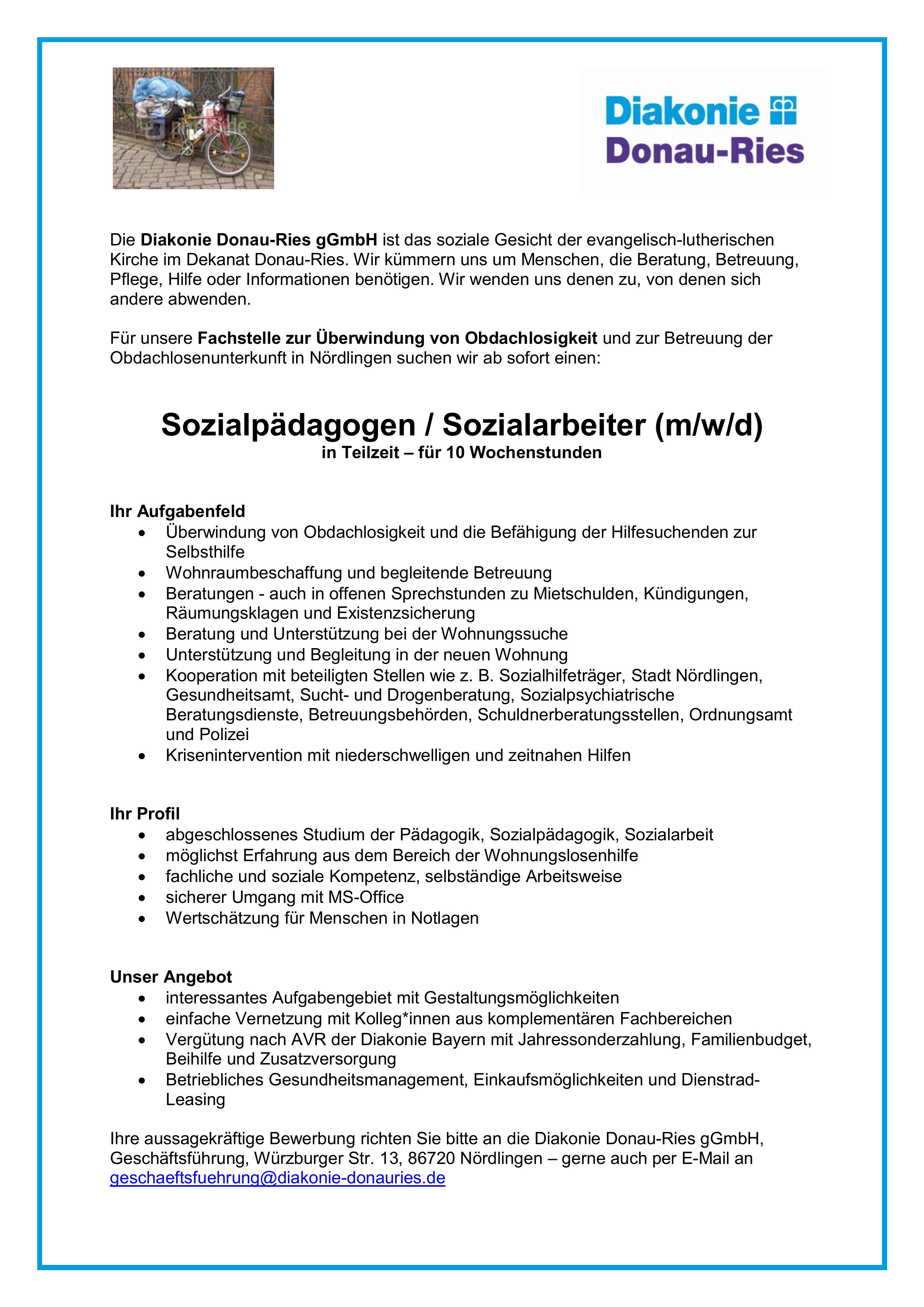 16. April 2026 Teilzeit Sozialpädagoge / Sozialarbeiter (m/w/d) Diakonie Donau-Ries gGmbH Geschäftsführung Würzburger Straße 13 86720 Nördlingen E-Mail: geschaeftsfuehrung@diakonie-donauries.de Zur Webseite » Bild: privat Stellenanzeige herunterladen Soziales