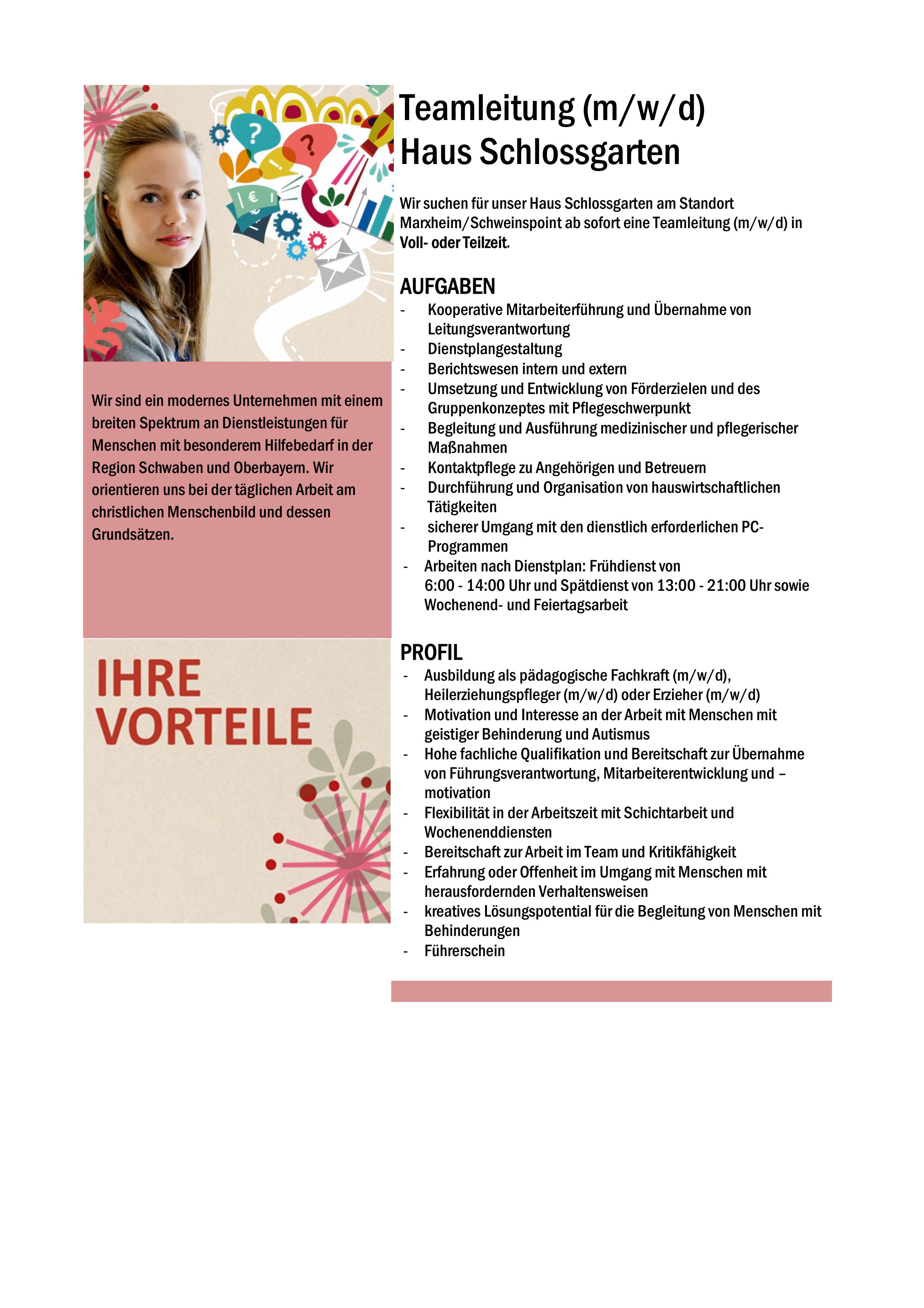 10. Oktober 2025 Top-Job Vollzeit Teilzeit Teamleitung (m/w/d) Sankt Johannes Schloßstraße 8 86688 Marxheim Zur Webseite » Bild: privat Stellenanzeige herunterladen Erziehung Soziales