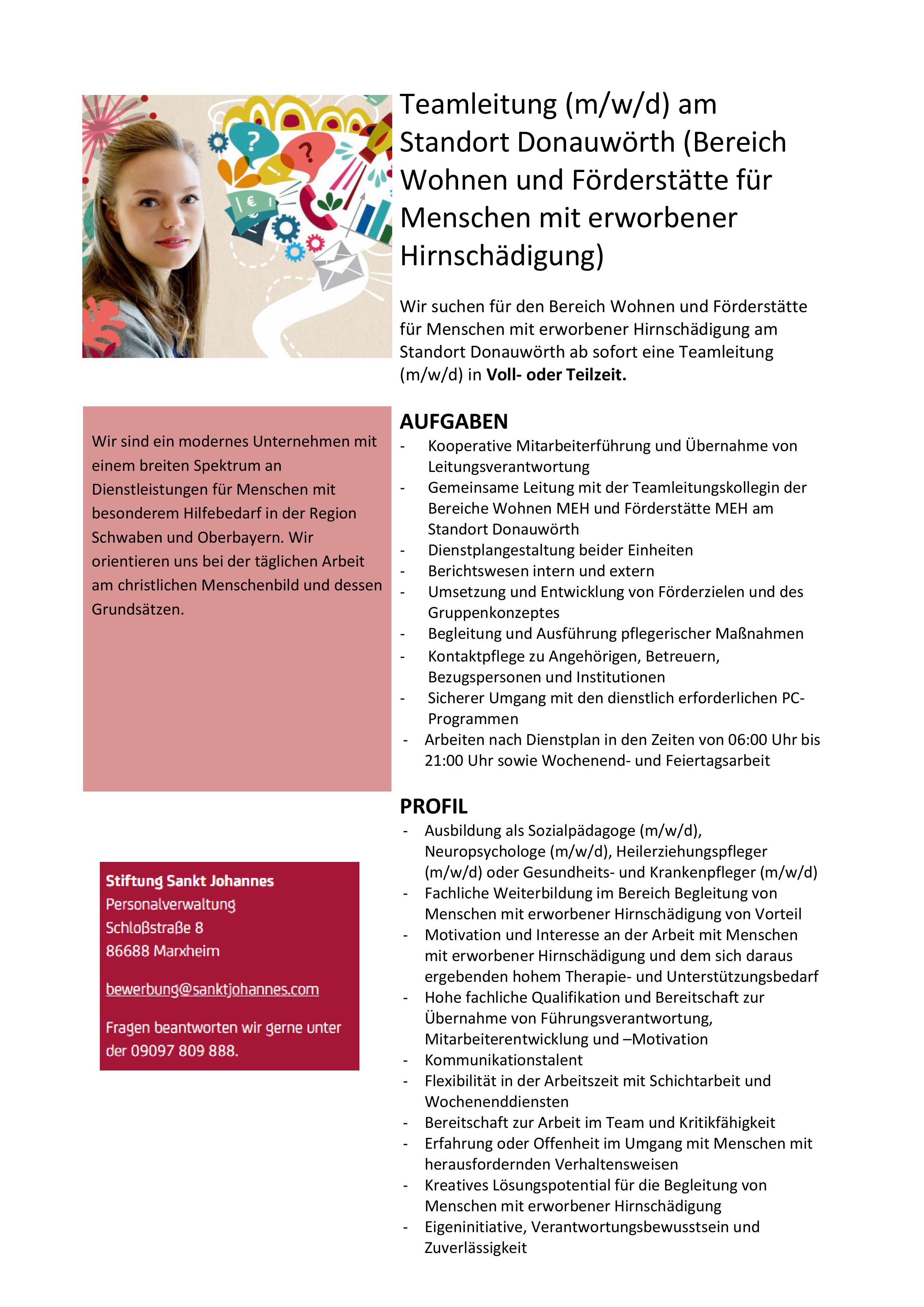 14. Oktober 2025 Top-Job Vollzeit Teilzeit Teamleitung (m/w/d) Sankt Johannes Schloßstraße 8 86688 Marxheim Zur Webseite » Bild: privat Stellenanzeige herunterladen Erziehung Soziales