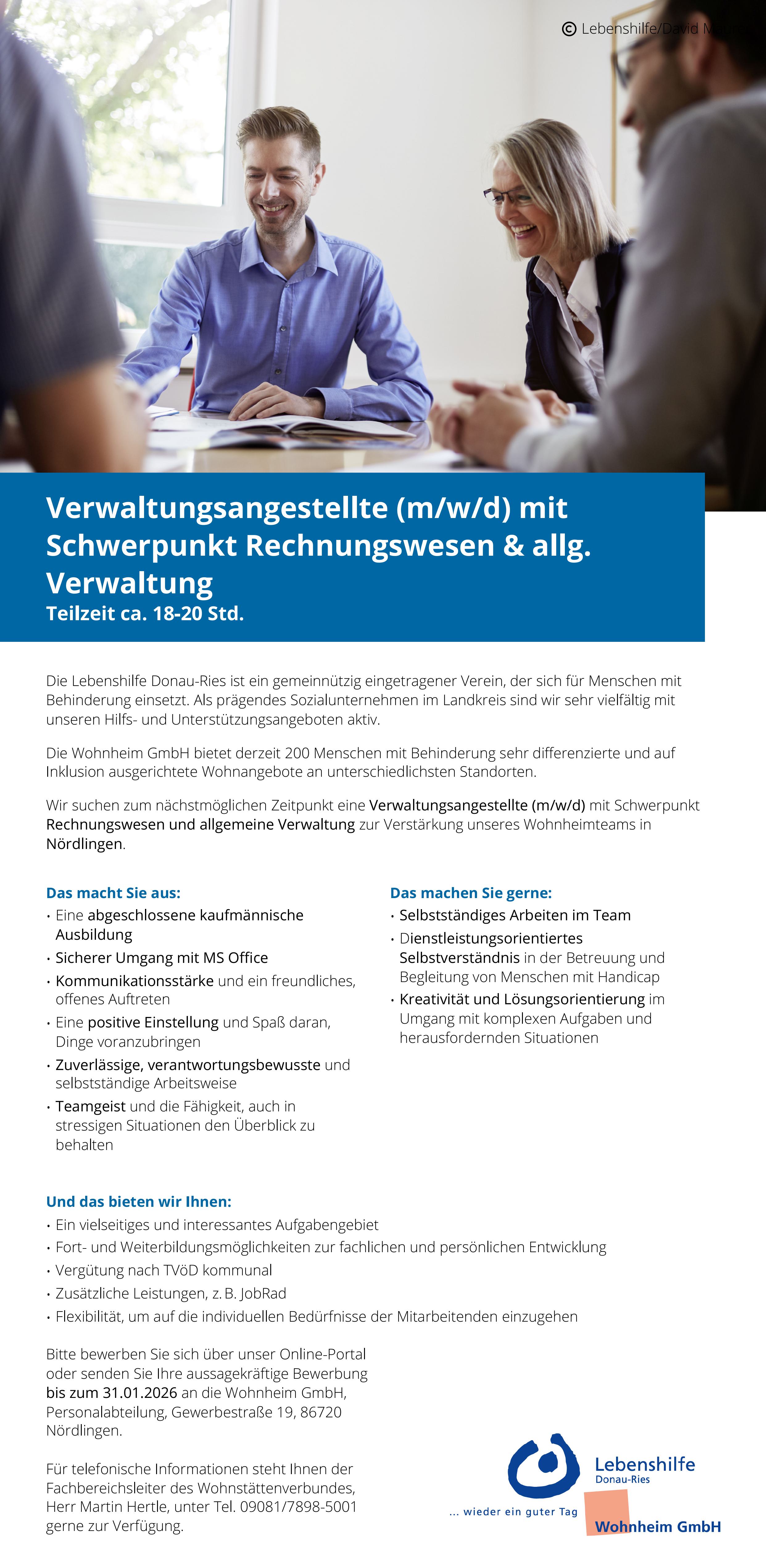 19. Dezember 2025 Top-Job Teilzeit Lebenshilfe Donau-Ries Wohnheim GmbH Verwaltungsangestellter (m/w/d) Lebenshilfe Donau-Ries e.V. / Wohnheim GmbH Personalverwaltung Gewerbestraße 19 86720 Nördlingen Zur Webseite » Online bewerben » Bild: privat Stellenanzeige herunterladen Büro Verwaltung
