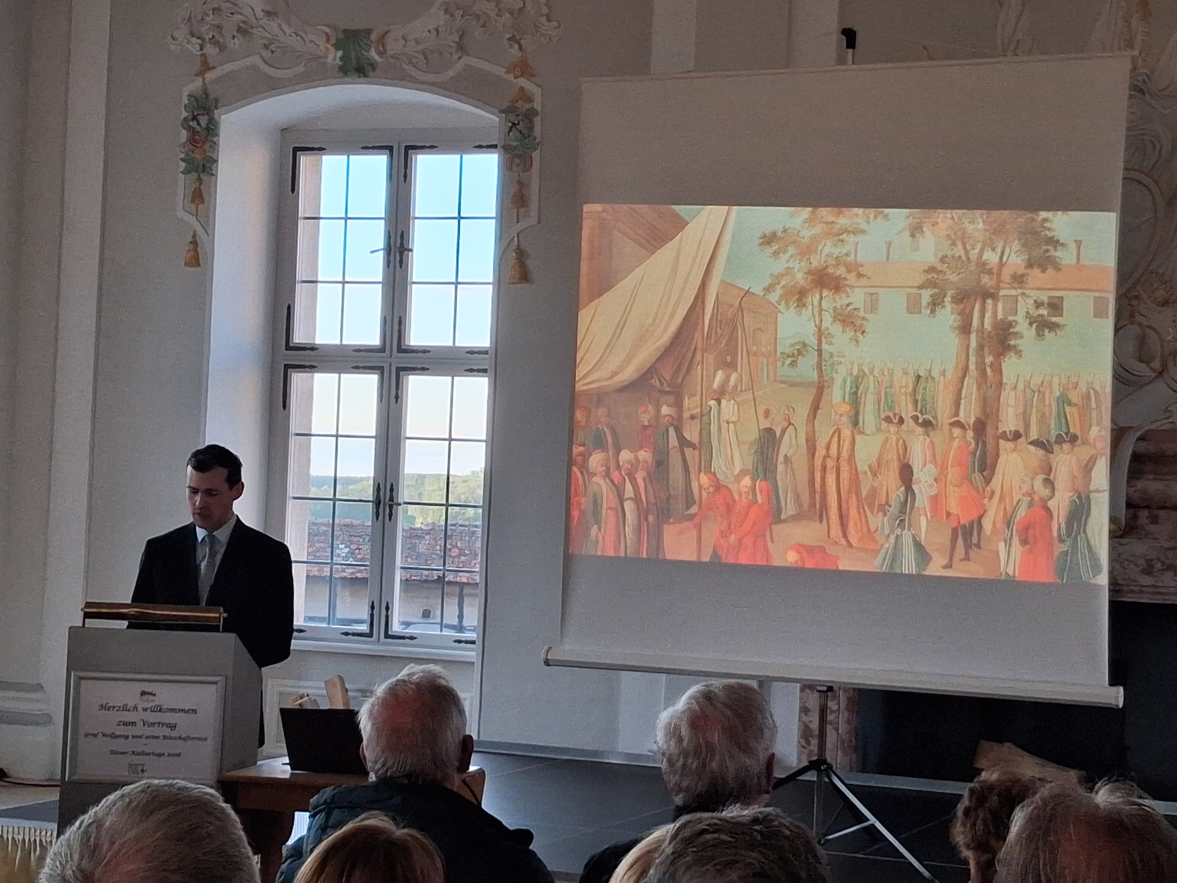 Zunächst stellte Bidlingmaier die Vita von Graf Wolfgang IV. zu Oettingen-Wallerstein (1629–1708) vor und schilderte dessen Beitrag zum Abschluss des Friedensvertrags von Karlowitz 1699. Anschließend kam er zu Auftrag, Reise und Verlauf der mit 278 Teilnehmern bis dahin größten kaiserlichen Großbotschaft. Diese „Sondergesandtschaft auf höchster diplomatischer Ebene“ führte Wolfgang und seine Begleiter 1.550 Kilometer von Wien nach Istanbul. Bidlingmaier nahm die interessierten Zuhörer mit auf die abenteuerliche Reise.