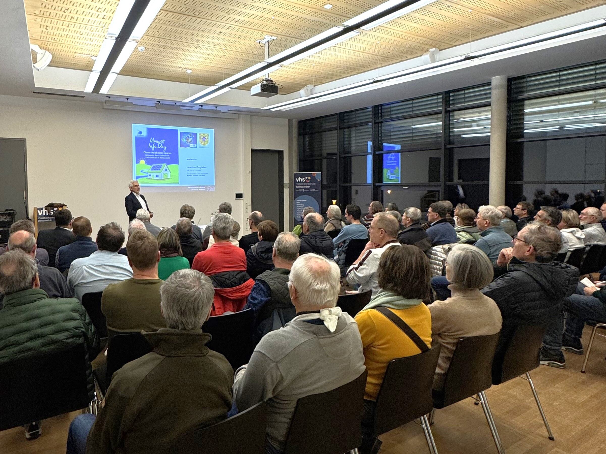 Sehr ermutigend war die Botschaft, dass Wärmepumpen in den allermeisten Bestandsgebäuden problemlos funktionieren. Energieberater Leonhard Taglieber berichtete aus über 30 Jahren Erfahrung – nur zweimal war eine Installation nicht möglich. In Kombination mit einer eigenen Photovoltaikanlage rechnet sich eine Wärmepumpe meist schon nach kurzer Zeit.
