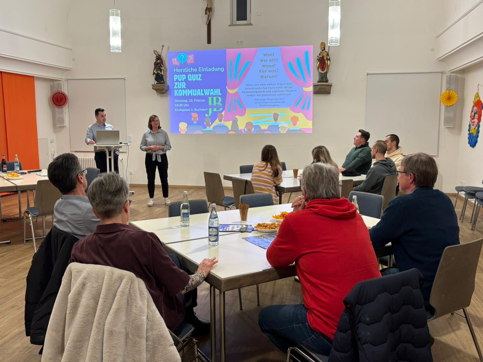 Zum gemütlichen Pub-Quiz-Abend haben die jungen Kandidatinnen und Kandidaten für den Gemeinderat in Buchdorf und den Kreistag ins Pfarrheim in Buchdorf eingeladen. „Wir wollen nicht die Entscheidungen der Vergangenheit anzweifeln, sondern die Zukunft gestalten. Unvoreingenommenheit, neue Ideen und eine ganze Portion Engagement sind das Erfolgsrezept für junge Leute, die sich einbringen wollen!“