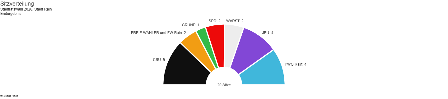Am 8. März hat der Landkreis Donau-Ries gewählt - so auch die Bürgerinnen und Bürger in Rain. Ein kurzer Rückblick vorab: Bei der vergangenen Kommunalwahl, sprich im Jahr 2020, setzte sich in der Stichwahl Karl Rehm (PWG) gegen Claudia Marb (CSU) mit 55,5 Prozent der Stimmen durch und wurde damit Bürgermeister von Rain. Die Wahlbeteiligung lag damals bei 68 Prozent. Und so verteilten sich bislang die insgesamt 20 Sitze im Rainer Stadtrat:
