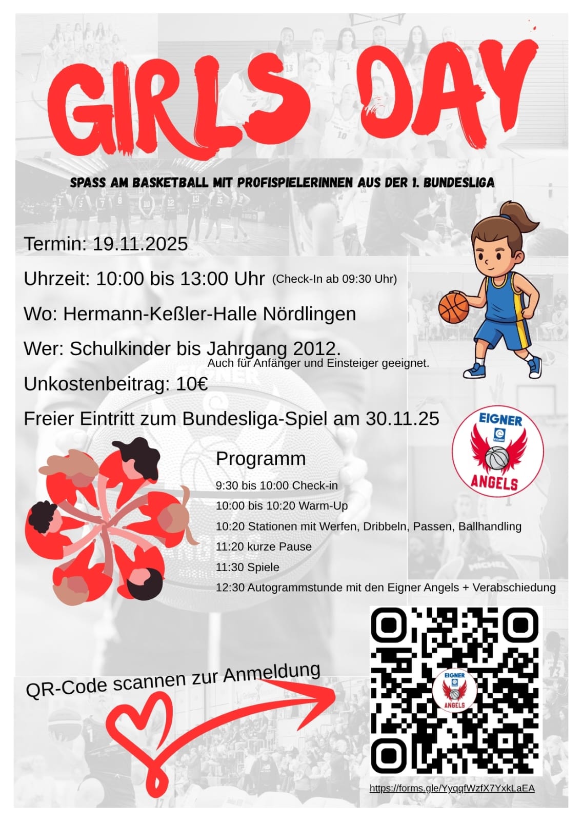 Unter dem Motto „Spaß am Basketball mit Profispielerinnen aus der 1. Bundesliga“ bekommen die Mädchen einen spannenden Einblick in das Training der Angels. Egal ob Anfängerin oder bereits Vereinsspielerin – alle sind herzlich willkommen! Die Teilnahme ist für Schulkinder bis Jahrgang 2012 möglich, der Unkostenbeitrag beträgt 10 Euro.