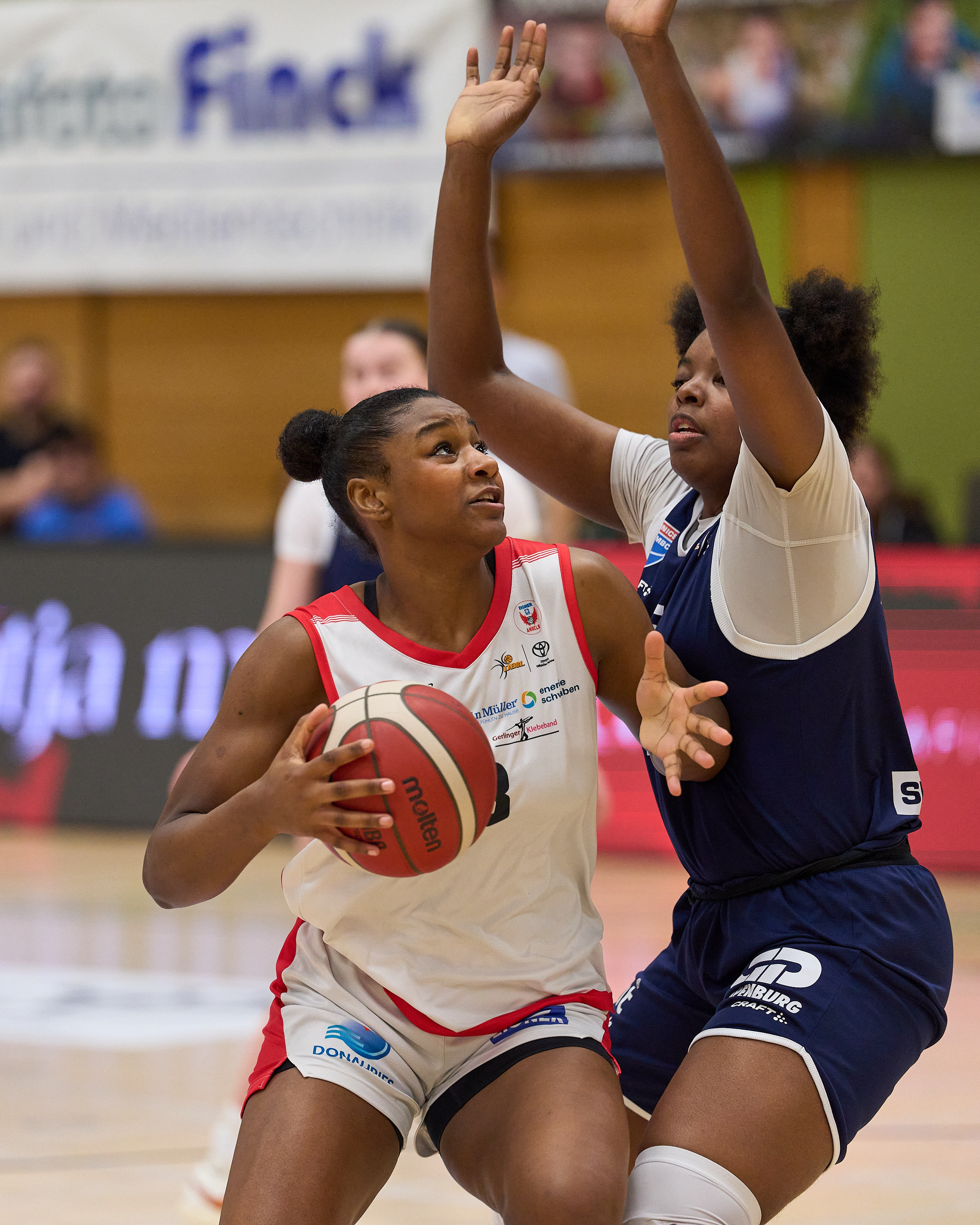 Erfreuliche 565 Zuschauerinnen und Zuschauer hatten an diesem klirrend kalten Sonntagnachmittag den Weg in die Hermann-Keßler-Halle gefunden und konnten ihren Augen nicht trauen, wie die Würfe, die ihre Angels auf den Gästekorb abfeuerten, ihr Ziel verfehlten. Wie eingefroren wirkten die Handgelenke der Angels-Spielerinnen. Die Mädels von Headcoach Kuusi versuchten alles, hängten sich in der Verteidigung voll in die Seile und konnten das Match dadurch lange offen halten, aber wenn die eigenen Würfe einfach nicht fallen, ist ein Sieg in der 1. Bundesliga nicht möglich. Wie wichtig Topstar Nicole Fransson für ihr Team ist, wird vor allem dann sichtbar, wenn sie eben nicht performen kann. Sichtbar angeschlagen und am Knie gehandicapt und ohne eine einzige Trainingseinheit während der Woche war von der Kanadierin nicht viel zu erwarten. Dass sie dennoch auf für sie magere 13 Punkte kommt, ist ihr hoch anzurechnen, hilft dem Team aber nicht, um zu gewinnen.