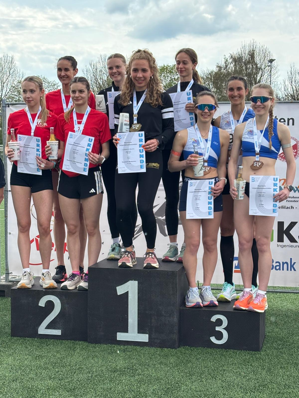 Getragen durch das Anfeuern der aufs Stadion verteilten, restlichen Donau-Rieser konnte sie weitere Staffeln überholen. Nach vier starken Runden durch die eigentlich auf längere Strecken spezialisierten Tabea und Laura, kam der Stab schließlich zu Schlussläuferin Stefanie. Als Läuferin mit klarem Fokus auf die 800 m ließ sie dann nichts mehr anbrennen und brachte die Bronzemedaille mit einem starken Schlussspurt in 7:41,05min sicher ins Ziel.